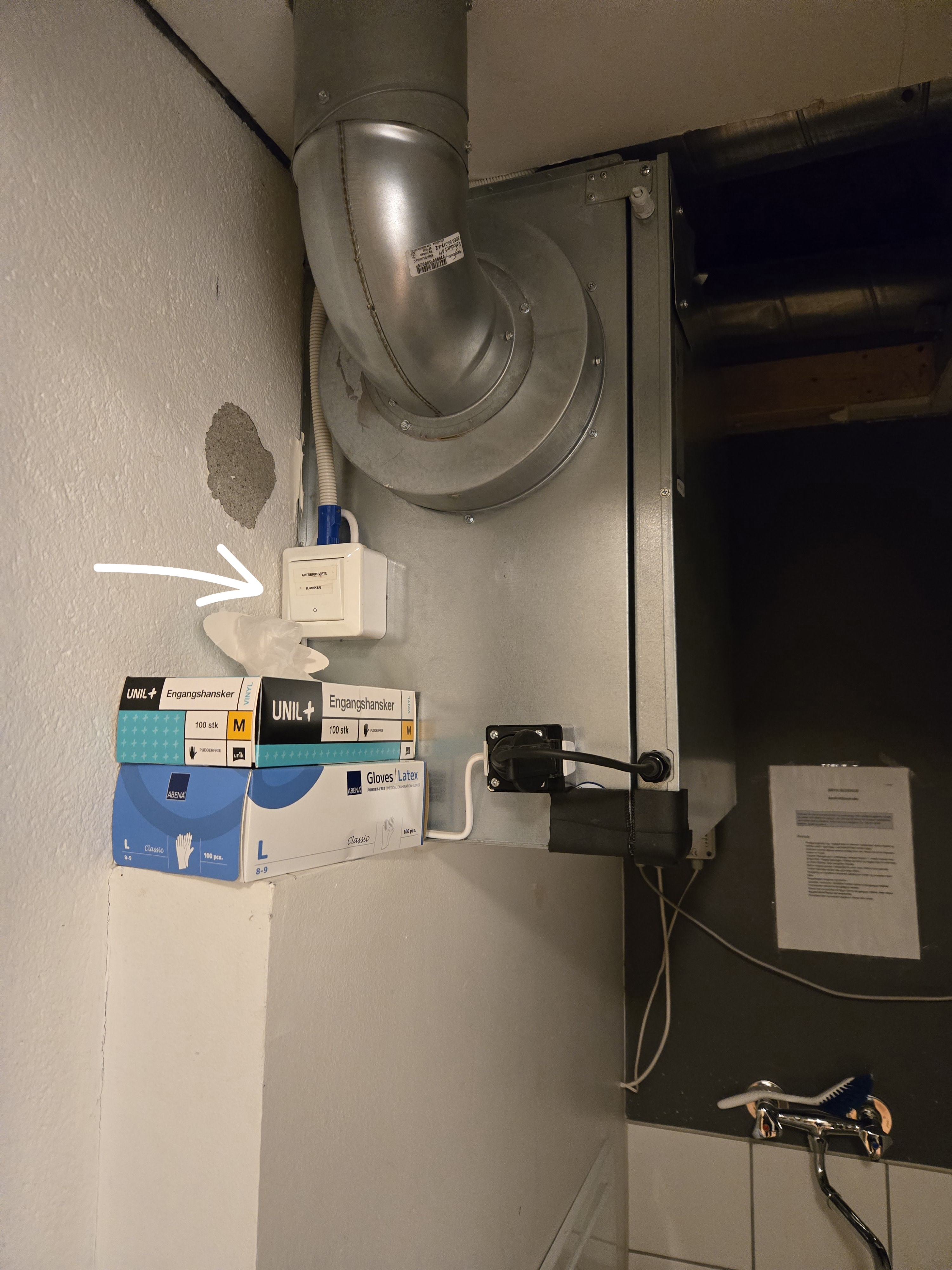 Skru av avtrekksviften inne på boden som er inn til venstre når du kommer inn på kjøkkenet fra garderoben.